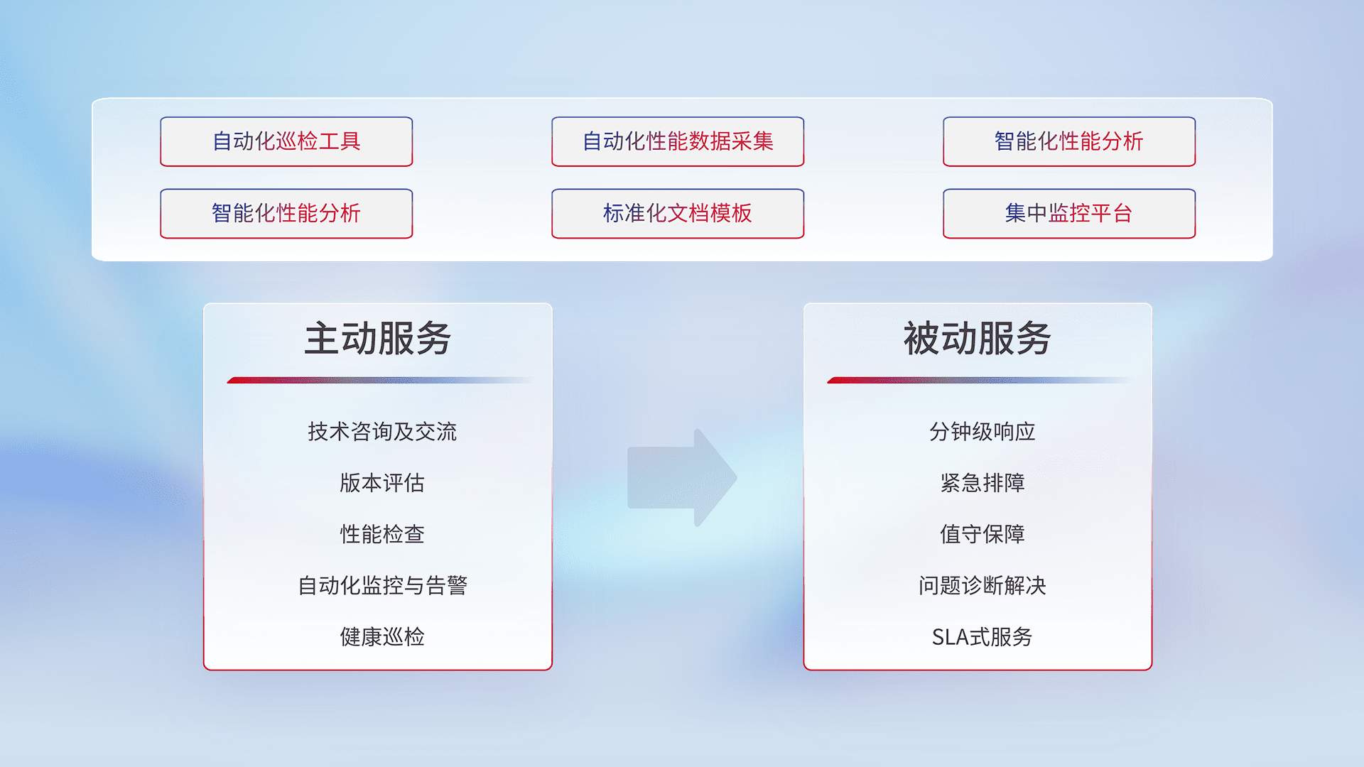 智能化工具和标准化文档,,保障服务质量,,,提供主动服务(包含技术咨询、、、、版本评估、、、性能检查、、、、自动化监控与告警、、、、健康巡检)和被动服务包含(分钟级响应、、紧急排障、、、、值守保障、、问题诊断解决、、、SLA服务)。。。