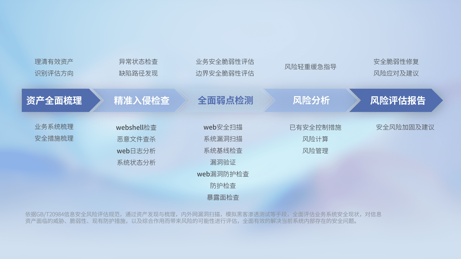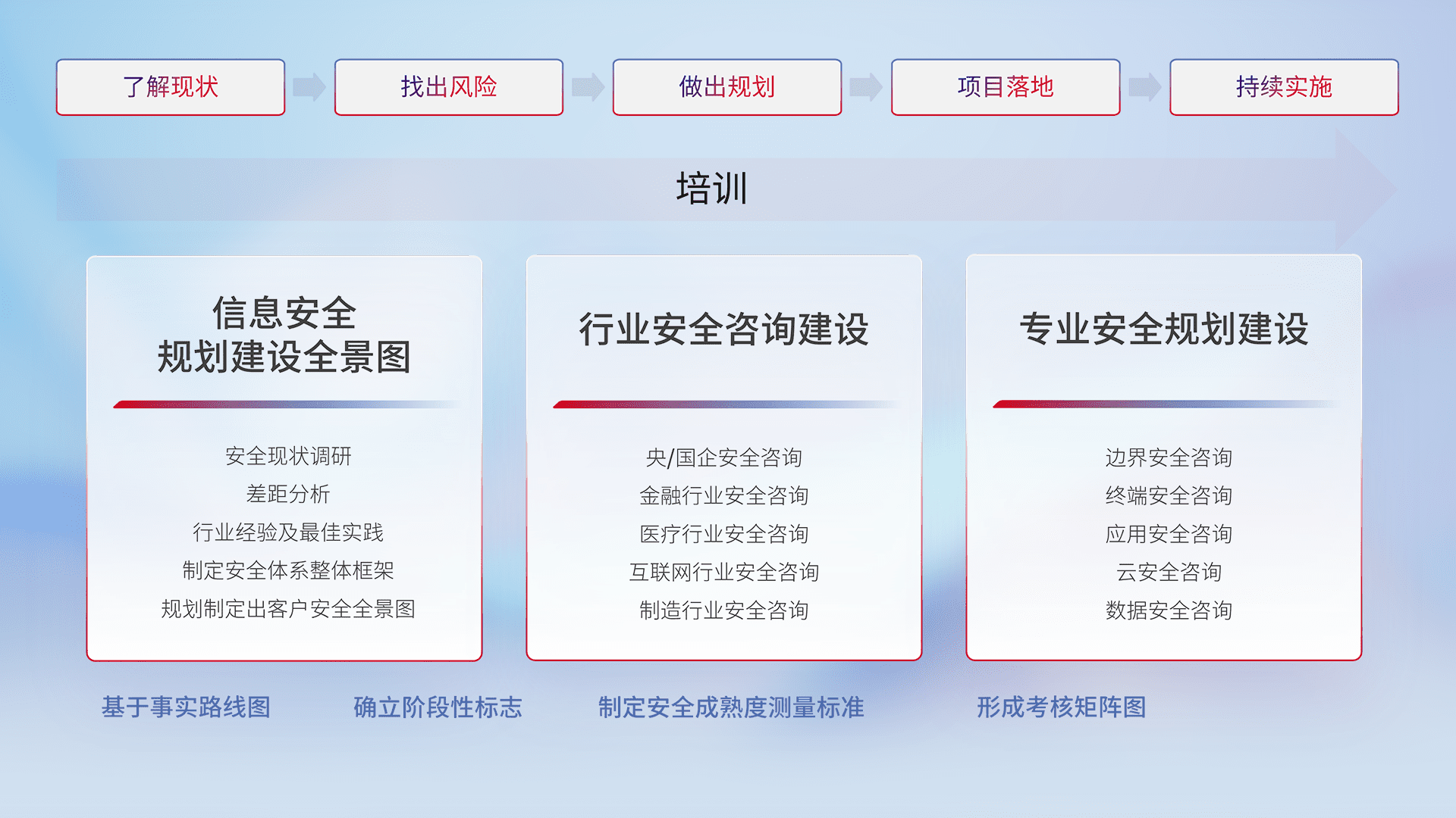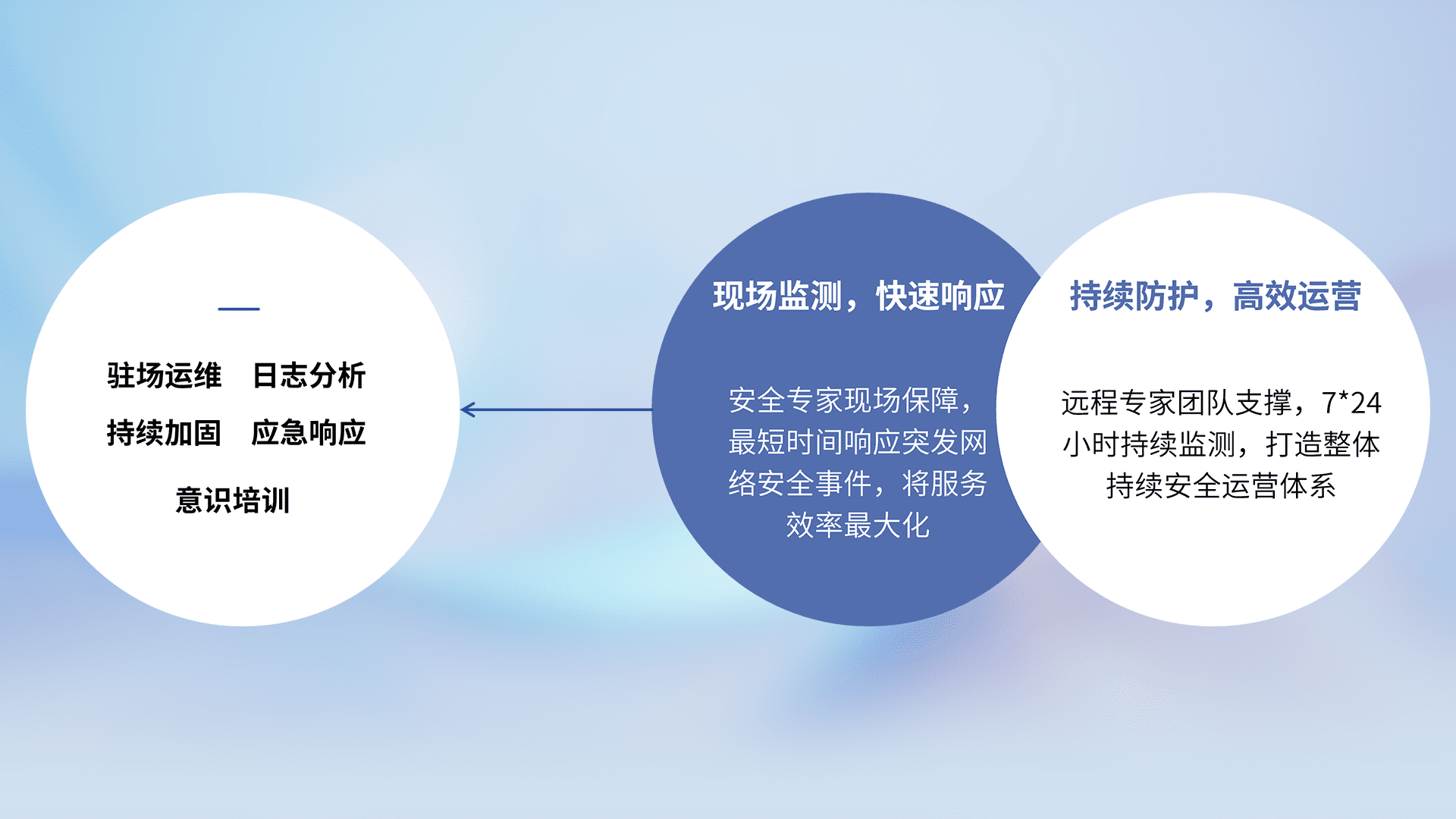 针对客户行业特性,,,,以专业的安全服务+多厂商联合解决方案提供专属的一站式安全管理服务,,,,帮助客户全面感知网络空间威胁,,基于识别、、检测、、、、分析、、、、防护、、、监测、、、响应的服务理论模型,,从方案咨询、、集成交付、、评估验证、、、、优化加固、、运维运营,,,致力于为客户提供完整的闭环管理式安全服务。。。。以实战经验为客户打造高抵御风险的安全体系,,帮助客户发现威胁、、、对抗威胁、、处置威胁,,,,不断积累安全对抗能力,,,持续保障数字化安全。。
